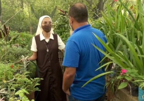 Irmã Sara, recém chegada ao Centro é que rega os viveiros de plantas. Com água puxada por um motor, alimentado pela luz do sol. “Vem da barragem. É enviada a água para caixa, chega lá na casa de cima e essa água da caixa faz a distribuição para todo o Centro”, destacou.