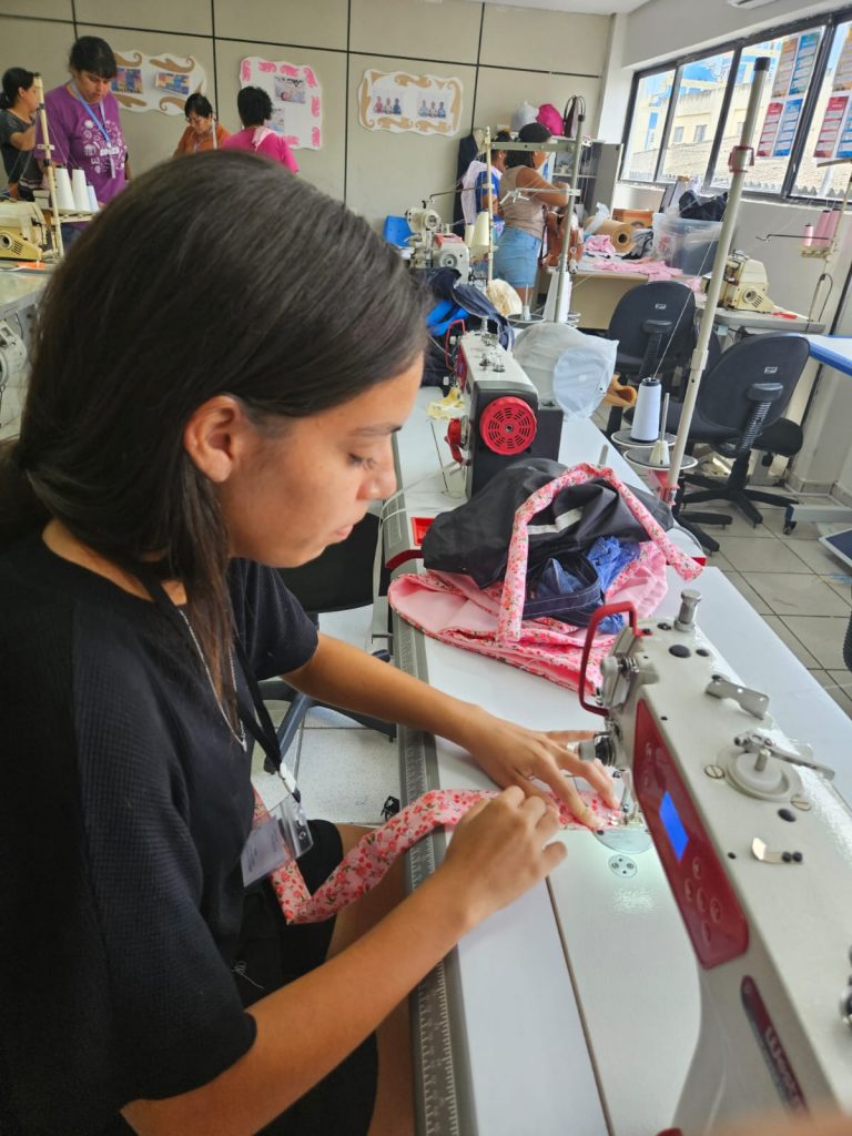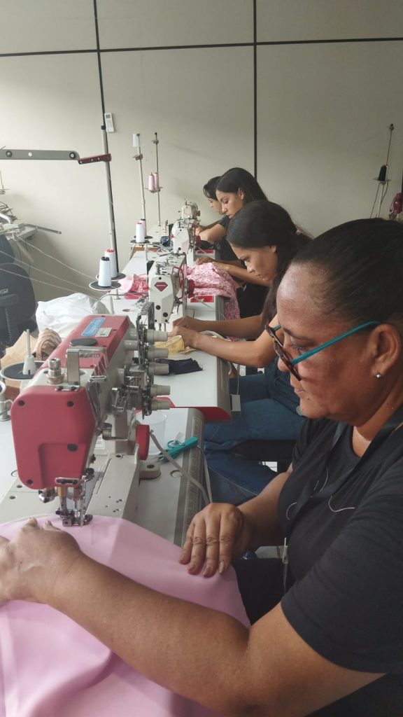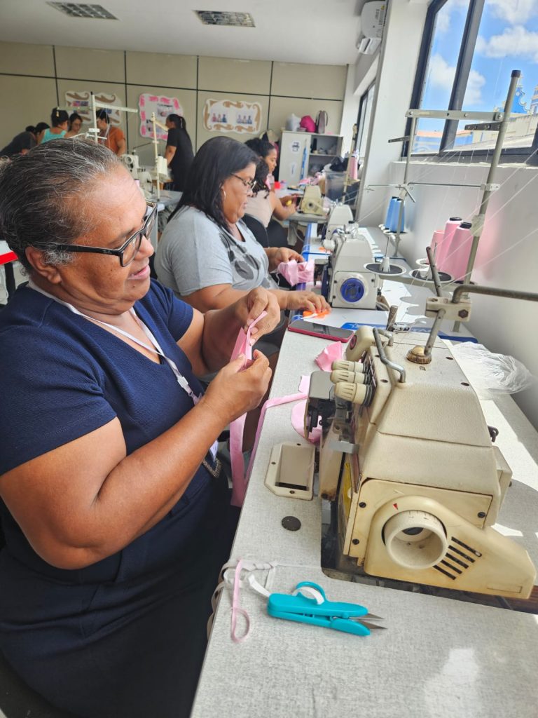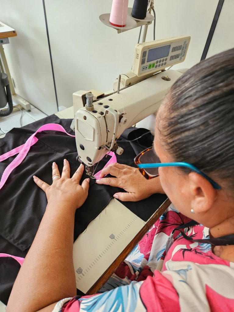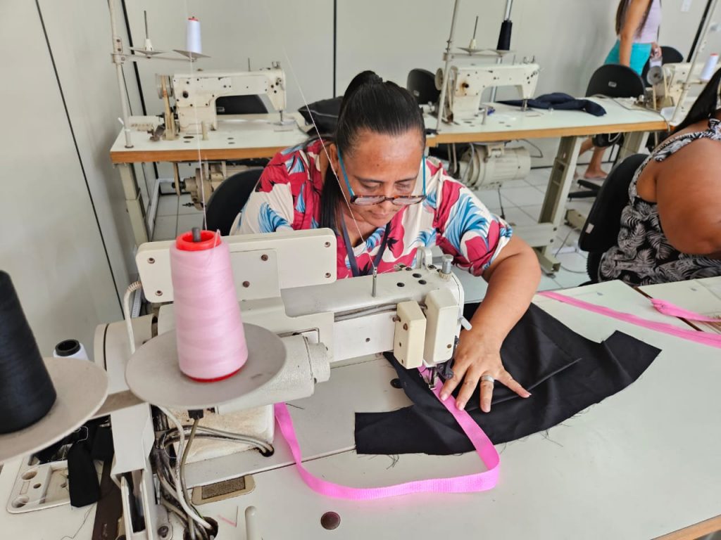 Já nos cursos têxteis (‘Enxoval para Bebês’ e ‘Moda Praia’), o foco é em design, corte, costura, confecção de peças e comercialização, com oficinas de comércio eletrônico e estratégias de empregabilidade.