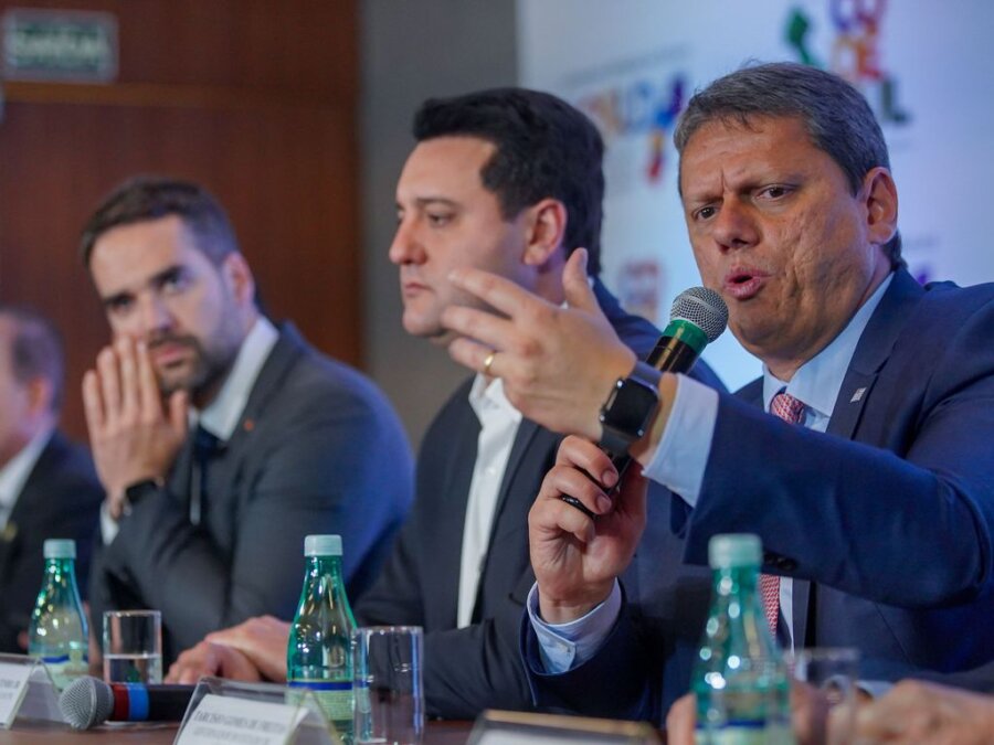 Da esquerda para a direita: os governadores Eduardo Leite, Ratinho Jr. e Tarcísio Freitas após reunião com parlamentares para tratar da reforma tributária. Foto: Rafa Neddermeyer/Agência Brasil